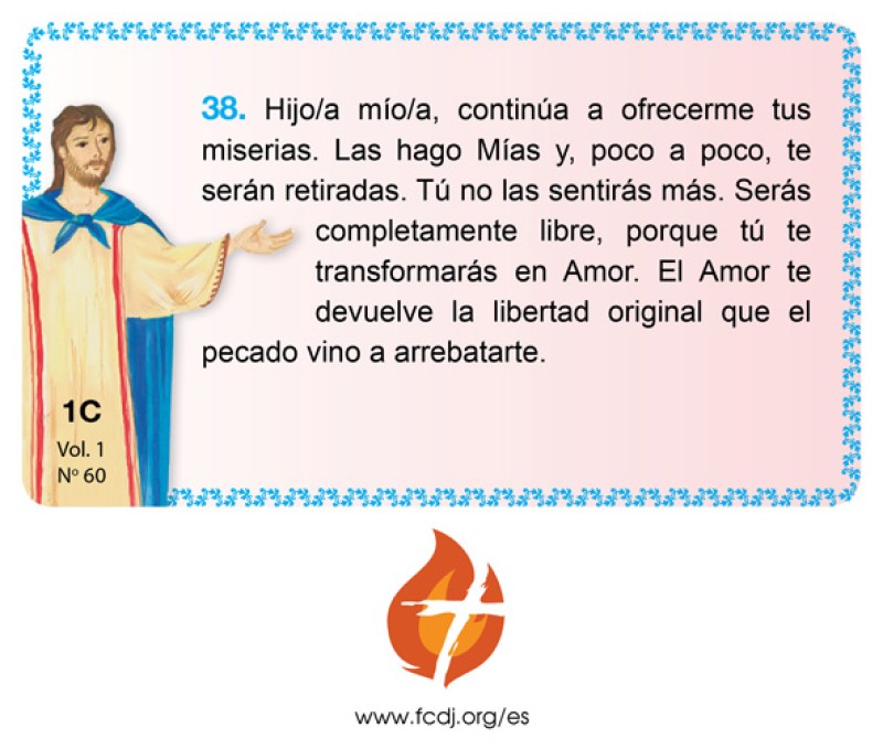 Hijo/a mío/a, continúa a ofrecerme tus miserias. Las hago Mías y, poco a poco, te serán retiradas. Tú no las sentirás más. Serás completamente libre, porque tú te transformarás en Amor. El Amor te devuelve la libertad original que el pecado vino a arrebatarte.