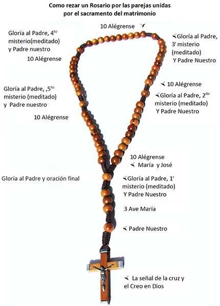 Ce chapelet peut être prié en partie ou en tout, seul, en couple ou en groupe, avec l’assurance de la puissance de l’union dans la prière. Chaque mystère est médité à l’intention des couples du monde entier unis par le sacrement du mariage.